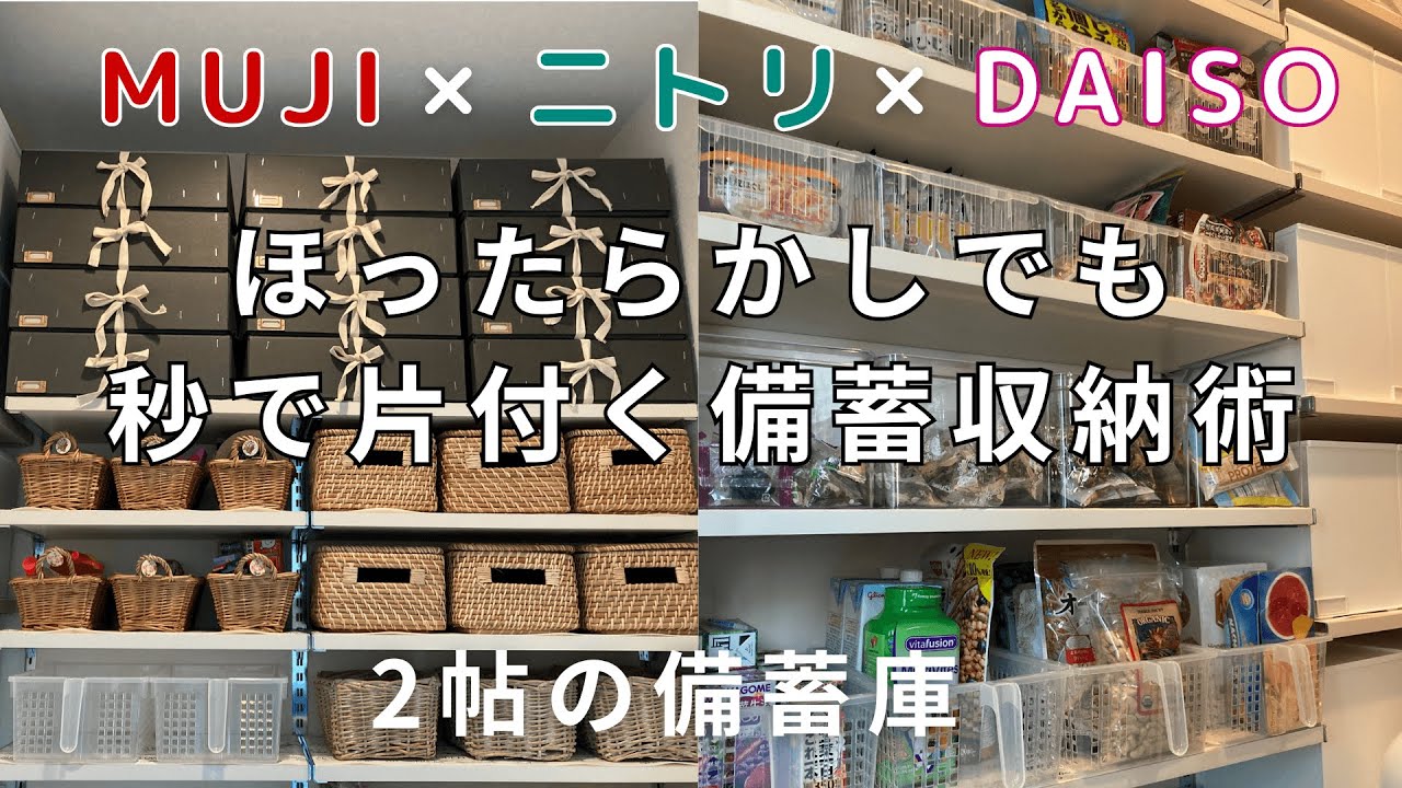 | タイトル | 【ズボラでも秒で片付く!】MUJI×ニトリ×100均|2帖の備蓄庫 神収納7選 |