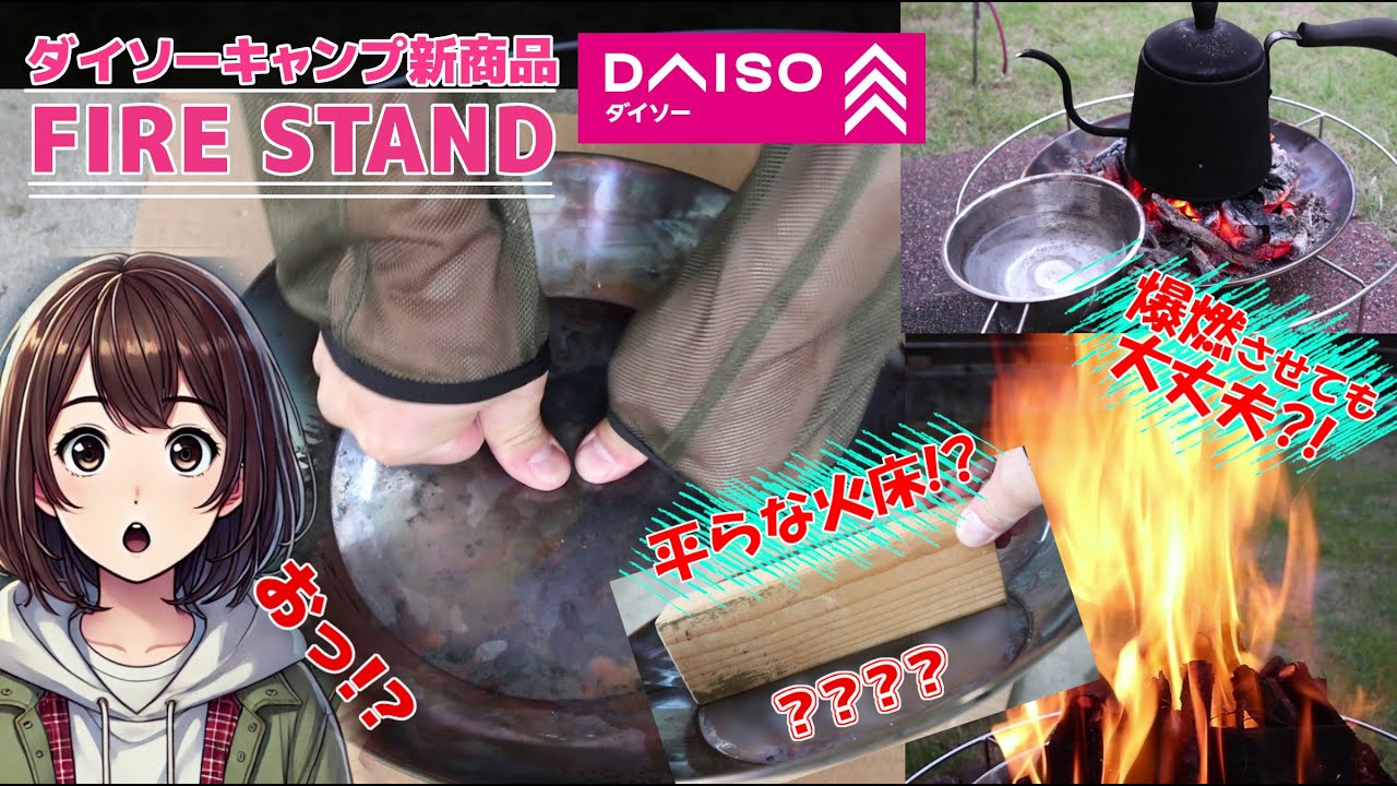タイトルダイソーキャンプ新商品【ファイアースタンド】爆燃キャンプ!焚き火台の火床改善DIY|工具不要でドーム状の火床を平らにするワザ?!|100均キャンプギア
